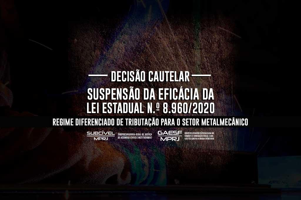 O Ministério Público do Estado do Rio de Janeiro (MPRJ), por meio da Subprocuradoria-Geral de Justiça de Assuntos Cíveis e Institucionais (SUBCÍVEL/MPRJ) e da Assessoria de Atribuição Originária em Matéria Cível, mediante provocação do Grupo de Atuação Especializada em Combate à Sonegação Fiscal e aos Ilícitos contra a Ordem Tributária (GAESF/MPRJ), obteve, decisão cautelar de suspensão da eficácia da Lei Estadual n.º 8.960/2020, que dispõe sobre a instituição de regime diferenciado de tributação para o setor metalmecânico. A decisão foi proferida pelo Órgão Especial do Tribunal de Justiça.