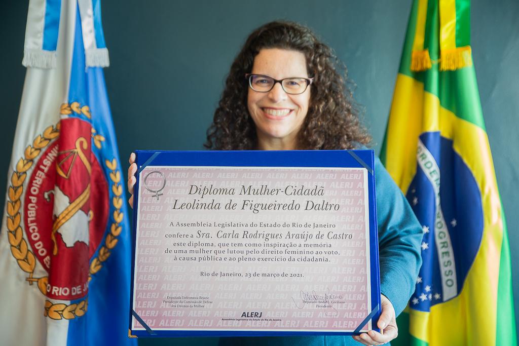 O diploma foi entregue pela coordenadora da CDDM/Alerj, Luciana Targino: "A gente concede essa homenagem pela sua luta, militância em defesa dos direitos da mulher", disse Luciana. Carla Araújo também foi presenteada com uma orquídea, entregue pela assessora da CDDM Márcia Nobua.