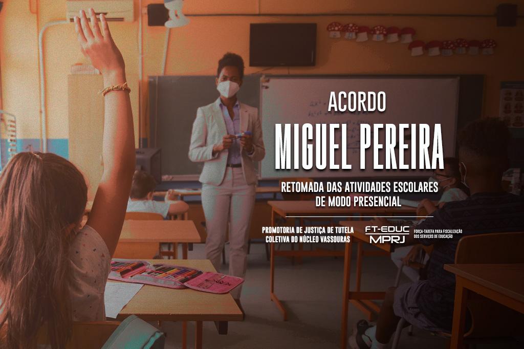O Ministério Público do Estado do Rio de Janeiro (MPRJ), por meio da Força-Tarefa de Educação (FT-Educação/MPRJ), da Promotoria de Justiça de Miguel Pereira, e da Promotoria de Justiça de Tutela Coletiva do Núcleo Vassourase, e o Município de Miguel Pereira celebraram, no dia 29/09, acordo para a retomada das atividades escolares de modo presencial. Com o acordo, o Município se compromete a antecipar o cronograma de retorno presencial, para que a retomada das aulas para os alunos do Pré I e Berçário, Pré II e Maternal, e Pré III e Maternal ocorra até segunda-feira (04/10).