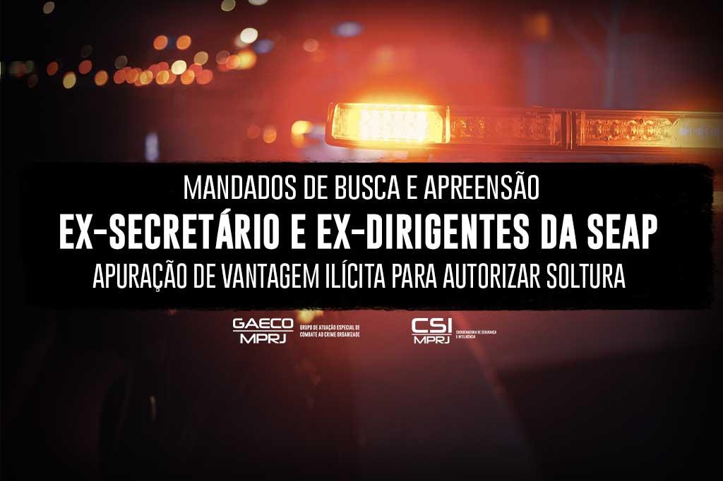 Com esse objetivo, os agentes do GAECO/RJ e da CSI/MPRJ cumprem os mandados de busca e apreensão na sede administrativa da Seap, no Centro, na sede administrativa do Complexo de Gericinó e no Instituto Penal Vicente Piragibe, para a obtenção de elementos que auxiliem as investigações.