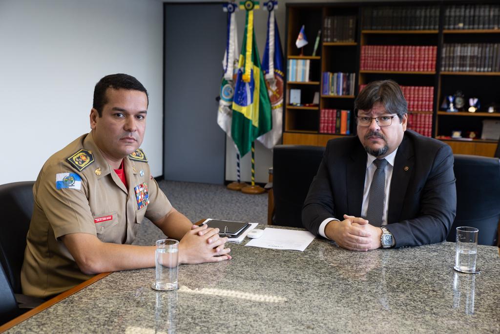 O procurador-geral de Justiça, Luciano Mattos, recebeu em seu gabinete, nesta quarta-feira (08/06), a visita do secretário de Estado de Defesa Civil e comandante-geral do Corpo de Bombeiros Militar, coronel Leandro Sampaio Monteiro. Os dois discutiram possíveis parcerias que poderão ser firmadas entre as instituições, além dos termos da colaboração atual entre o Corpo de Bombeiros e a Coordenadoria de Segurança e Inteligência (CSI/MPRJ).