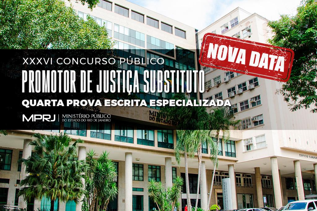 A aplicação da quarta e última prova escrita especializada do XXXVI Concurso Público para ingresso na classe inicial da carreira do Ministério Público do Estado do Rio de Janeiro (MPRJ) foi adiada para domingo, dia 24 de julho, mantida a sua realização no Instituto de Educação Roberto Bernardes Barroso (IERBB), localizado na Avenida General Justo nº 375, 4º andar, Centro do Rio.