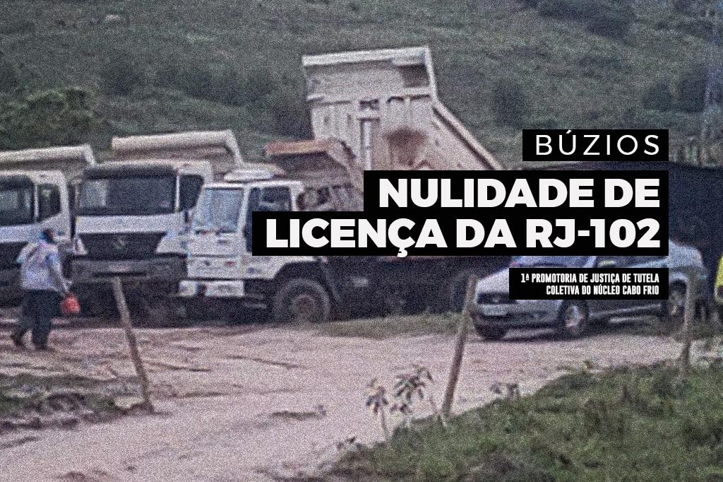 O Ministério Público do Estado do Rio de Janeiro (MPRJ), por meio da 1ª Promotoria de Justiça de Tutela Coletiva do Núcleo Cabo Frio, requereu à Justiça a nulidade da licença municipal de instalação da nova estrada RJ-102, em Búzios. A promotoria aponta que o Departamento de Estradas e Rodagem (DER) e o Município de Armação dos Búzios não apresentaram estudos e informações importantes sobre os impactos da obra, que também está em desacordo com o Plano Diretor do município.