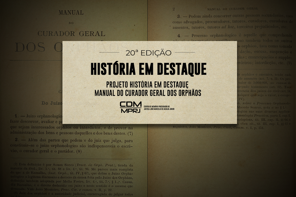 O Ministério Público do Estado do Rio de Janeiro (MPRJ), por meio do Centro de Memória Procurador de Justiça João Marcello de Araújo Júnior (CDM/MPRJ), apresenta, na 20ª edição do projeto História em Destaque, o segundo documento mais antigo do acervo do memorial: o livro Manual do Curador Geral dos Orphãos, publicado em 1906. A obra é a segunda edição revista publicada originalmente em 1890 pelo ex-Promotor Público e ex-Curador-Geral de Órfãos Oscar de Macedo Soares.