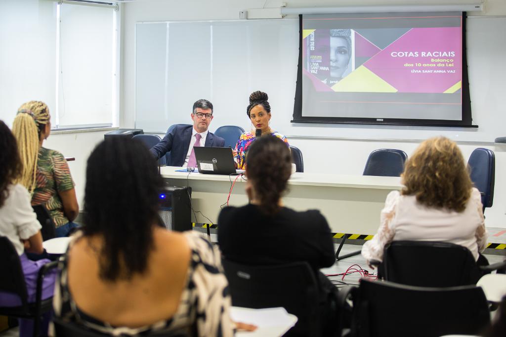 O Ministério Público do Estado do Rio de Janeiro (MPRJ), por meio da Coordenadoria-Geral de Promoção da Dignidade da Pessoa Humana (COGEPDPH/MPRJ) e do Instituto de Educação Roberto Bernardes Barroso (IERBB/MPRJ), realizou, na manhã desta terça-feira (29/11), a palestra “Cotas Raciais e Sistema de Justiça”, com a escritora e promotora de Justiça do Ministério Público do Estado da Bahia (MPBA), Lívia Sant'Anna Vaz. Participantes da mesa de abertura, o diretor do IERBB/MPRJ, promotor de Justiça Leandro Navega, a promotora Roberta Ribeiro e as procuradoras Patrícia Carvão e Eliane de Lima Pereira abriram o evento agradecendo a presença da escritora no MPRJ, destacando o engrandecimento da palestra para a instituição.