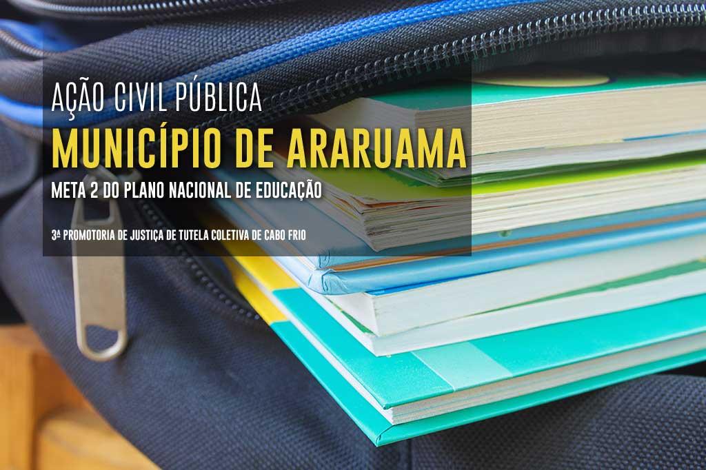 O Ministério Público do Estado do Rio de Janeiro (MPRJ), por meio da 3ª Promotoria de Justiça de Tutela Coletiva de Cabo Frio, ajuizou, no último dia 03 de março, ação civil pública com pedido de tutela de urgência para que o município de Araruama cumpra a Meta 2 do Plano Nacional de Educação (Lei 13.005/14). A Meta 2 prevê universalizar o ensino fundamental de nove anos para toda a população de 6 a 14 anos e garantir que pelo menos 95% dos alunos concluam essa etapa na idade recomendada, até o último ano de vigência deste PNE. Em relatório apresentado ao MPRJ, o município assume possuir 1.248 alunos em fila de espera, isto é, aguardando vaga para estudar.