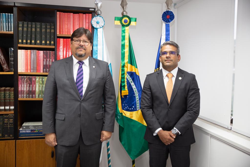 O procurador-geral de Justiça, Luciano Mattos, recebeu, na tarde desta quarta-feira (08/03), a visita do coordenador do Grupo de Trabalho “Polícia Cidadã - Redução da Letalidade Policial” do Conselho Nacional de Justiça (CNJ), conselheiro João Paulo Schoucair. O grupo foi criado por determinação do Supremo Tribunal Federal (STF) para acompanhar a exequibilidade do Plano de Redução de Letalidade Policial apresentado pelo Estado do Rio de Janeiro nos autos da Arguição de Descumprimento de Preceito Fundamental (ADPF) 635.