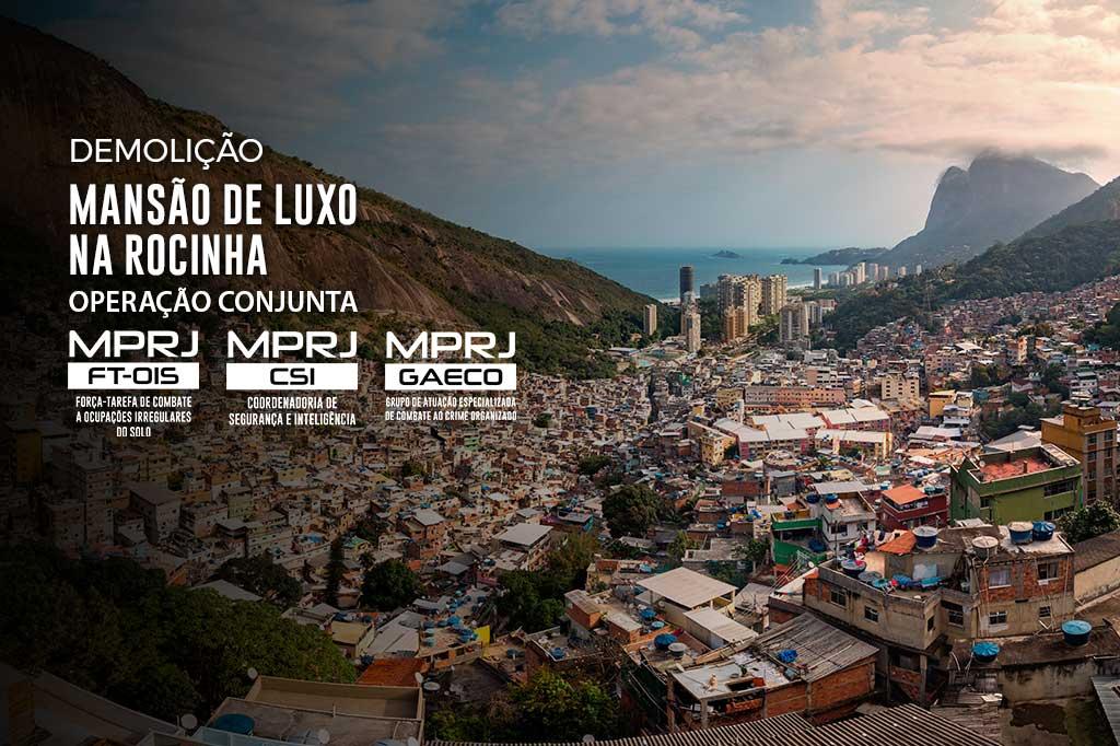 O Ministério Público do Estado do Rio de Janeiro (MPRJ), por meio da Força-Tarefa do Grupo de Atuação Especializada de Combate ao Crime Organizado para o Enfrentamento à Ocupação Irregular do Solo Urbano (GAECO/FT-OIS), e a Prefeitura do Rio, através da Secretaria de Ordem Pública, realizam, nesta quarta-feira (13/09), uma operação conjunta para demolir uma mansão de luxo com três andares e uma cobertura, que está sendo erguida na comunidade da Rocinha, Zona Sul do município. A operação conta com o apoio da Coordenadoria de Segurança e Inteligência (CSI/MPRJ).