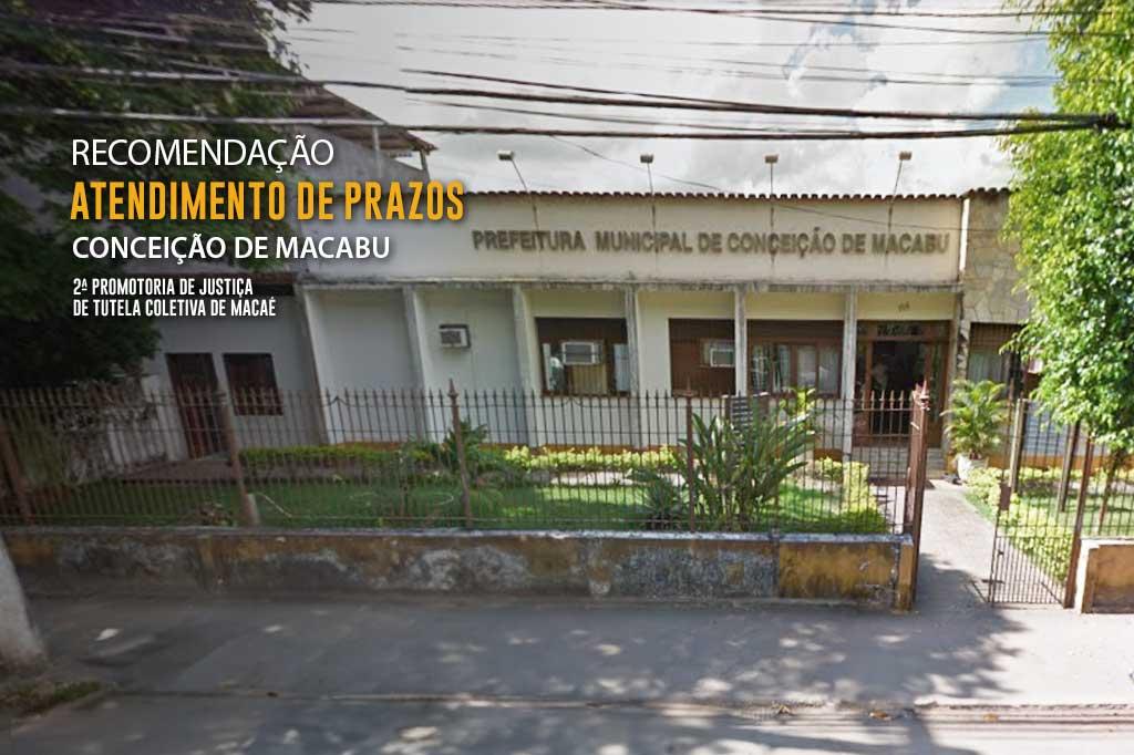 A 2ª Promotoria de Justiça de Tutela Coletiva de Macaé emitiu, nesta sexta-feira (29/09), Recomendação ao Município de Conceição de Macabu para que cumpra os prazos assinalados em todas as requisições já feitas pela Promotoria junto ao órgão. A Prefeitura terá 30 dias para atender à ordem legal. Caso a situação continue recorrente, o prefeito Valmir Lessa e o procurador-geral do município, Marcos Alves Pinto, poderão responder pelo desatendimento injustificado.