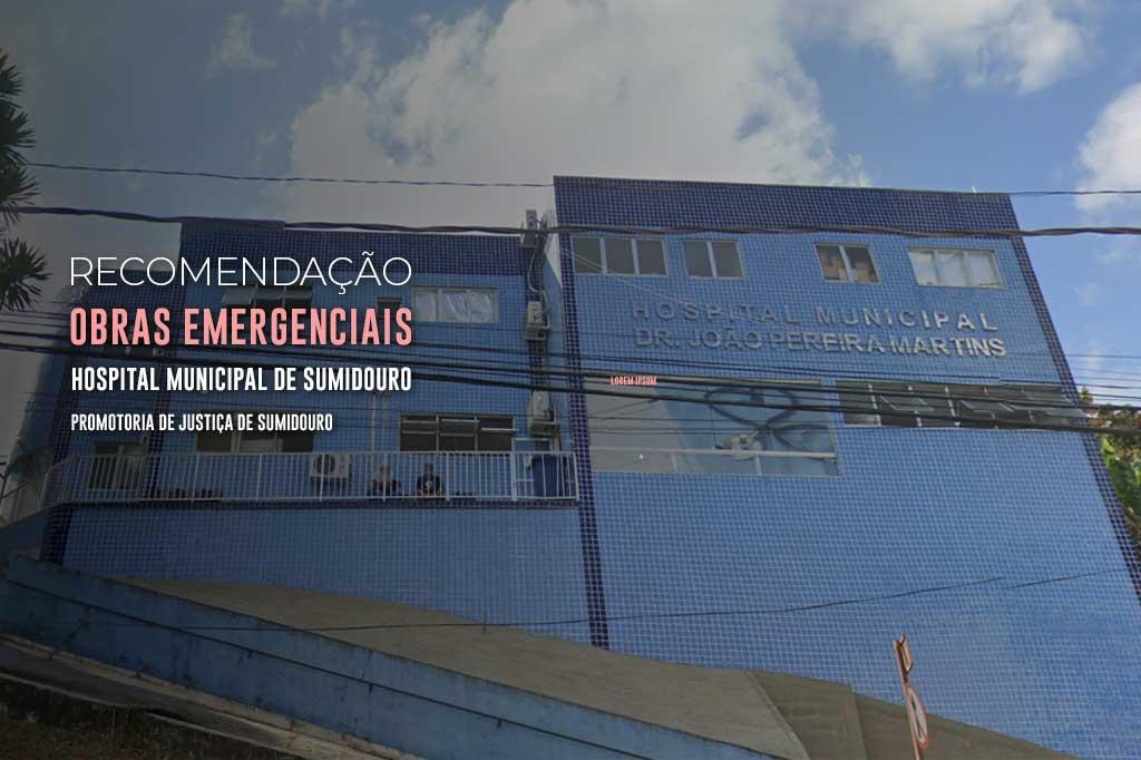 A Promotoria de Justiça de Sumidouro enviou na sexta-feira (27/10) Recomendação ao prefeito Eliésio Peres da Silva, à secretária municipal de Saúde, Maria Luiza Ferreira Barbosa e ao diretor do Hospital Municipal Dr. João Pereira Martins, Jorge Mariano dos Santos Ribeiro, para que realizem imediatamente reparos estruturais na unidade médica.