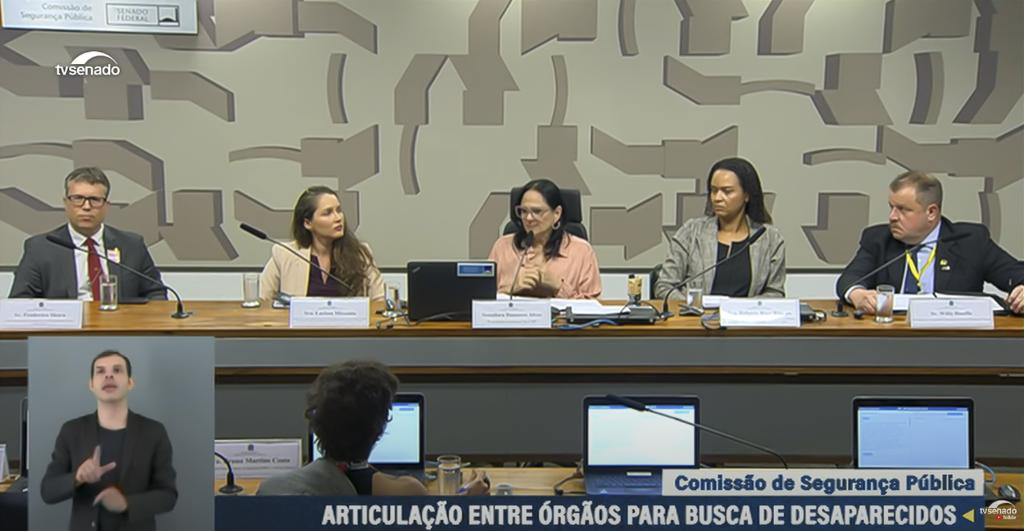 O Ministério Público do Estado do Rio de Janeiro (MPRJ) participou, na manhã desta quinta-feira (04/07), de uma audiência pública promovida pela Comissão de Segurança Pública (CSP) do Senado Federal para debater a busca de pessoas desaparecidas. Pelo MPRJ, participou a promotora de Justiça Roberta Rosa Ribeiro, coordenadora de Direitos Humanos e Minorias (CDHM/MPRJ). A audiência foi aberta pela senadora Damares Alves, presidente eventual da CSP, e teve a participação de representantes da Secretaria Nacional de Promoção e Defesa dos Direitos Humanos, Secretaria Nacional de Segurança Pública, Defensoria Pública Federal, Polícia Federal, Polícia Civil, Polícia Rodoviária Federal e Associação Brasileira de Criminalística.