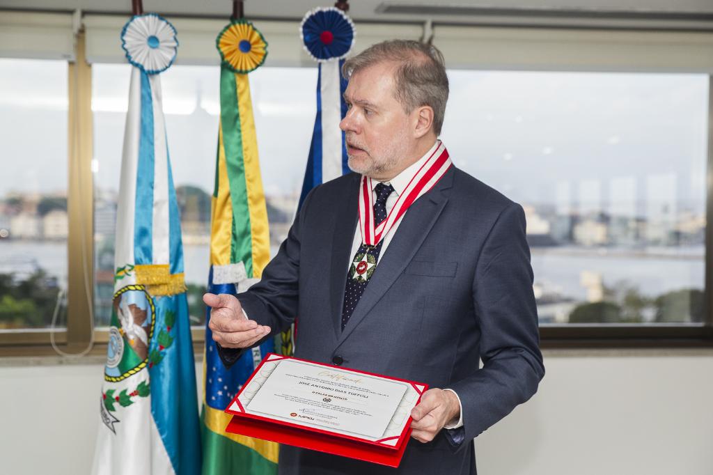O ministro do Supremo Tribunal Federal Dias Toffoli recebeu, nesta segunda-feira (08/12), o Colar do Mérito do Ministério Público do Estado do Rio de Janeiro (MPRJ), maior honraria concedida pela instituição. A entrega foi antecipada, uma vez que o ministro não poderá comparecer à solenidade oficial de outorga do colar, marcada para o dia 15 de dezembro. O procurador-geral de Justiça, Antonio José Campos Moreira, realizou a entrega da comenda.