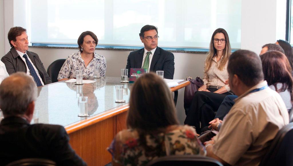 O procurador-geral de Justiça, Eduardo Gussem, e promotores de Justiça de Tutela Coletiva da Saúde da Capital e de Fundações reuniram-se, nesta quarta-feira (08/02), com o prefeito Marcelo Crivella e o secretário municipal de Saúde, Carlos Eduardo de Mattos. O encontro, que ocorreu na sede do Ministério Público do Estado do Rio de Janeiro (MPRJ), teve como objetivo buscar soluções para evitar a descontinuidade no atendimento em unidades de saúde após a suspensão de convênios da pasta com a Bio-Rio, Funrio e CEPSC (Centro de Estudos, Pesquisa e Desenvolvimento Tecnológico em Saúde Coletiva).
