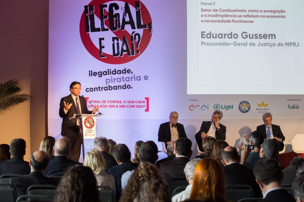 O procurador-geral de Justiça do Estado do Rio de Janeiro, Eduardo Gussem, participou como convidado, nesta quinta-feira (30/11), do seminário “Ilegal, e daí?”, realizado pelo jornal O GLOBO, em parceria com o Extra, Valor e Época, no Hotel Prodigy, no Centro do Rio. O evento, que aborda temas como ilegalidade, pirataria e contrabando, contou com a participação de profissionais de destaque tanto do setor público quanto privado. O secretário de Segurança Pública do Estado, Roberto Sá, participou da abertura, ao lado do presidente do Tribunal de Justiça do Rio, Milton Fernandes de Souza. Também dividiram o palco de debates o presidente da Light, Luís Fernando Paroli; e o presidente da Enel no Brasil, Carlo Zorzoli.
