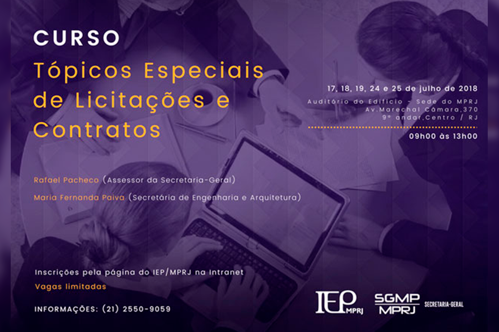 O Ministério Público do Estado do Rio de Janeiro, por meio do Instituto de Educação e Pesquisa (IEP/MPRJ) e da Secretaria-Geral (SGMP/MPRJ), promoveu nesta terça-feira (17/07), no auditório do edifício-sede, o primeiro dia de palestras sobre tópicos especiais de licitações e contratos. O curso prossegue nos dias 18, 19, 24 e 25 de julho.
