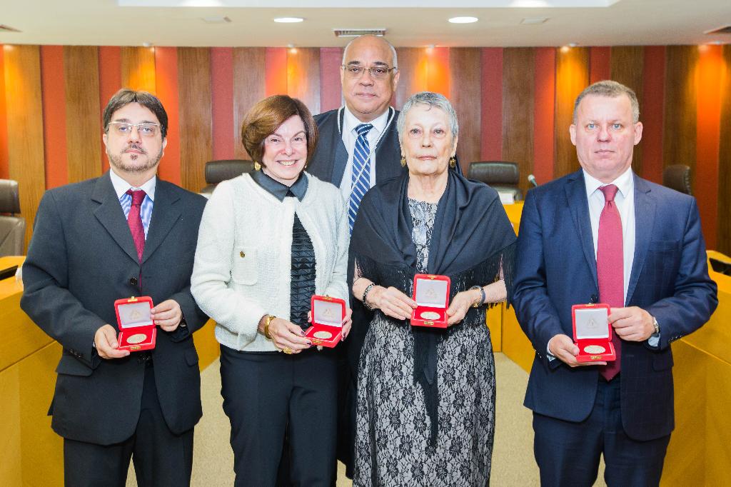 O Ministério Público do Estado do Rio de Janeiro (MPRJ) realizou, na tarde desta segunda-feira (22/10), a entrega da Medalha Campos Salles a membros aposentados. A solenidade ocorreu na Sala de Sessões dos Órgãos Colegiados. A comenda foi entregue àqueles cujos serviços prestados à instituição somaram mais de 20 anos de efetivo exercício na carreira. Assim, foram agraciadas as procuradoras de Justiça Elizabeth Machado Carneiro e Marly Saramago Hermann, além dos promotores Jorge Magno Reis Vidal, Rubem José Bastos Vianna e Ana Paula Pedra Lopes – esta última representada pela procuradora Márcia Tamburini, coordenadora do Laboratório de Análise de Orçamentos e Políticas Públicas (LOPP/MPRJ). A medalha recebe o nome do patrono do Ministério Público brasileiro, Manuel Ferraz de Campos Salles, que viveu entre os anos de 1841 e 1913, tendo sido o quarto presidente da República.