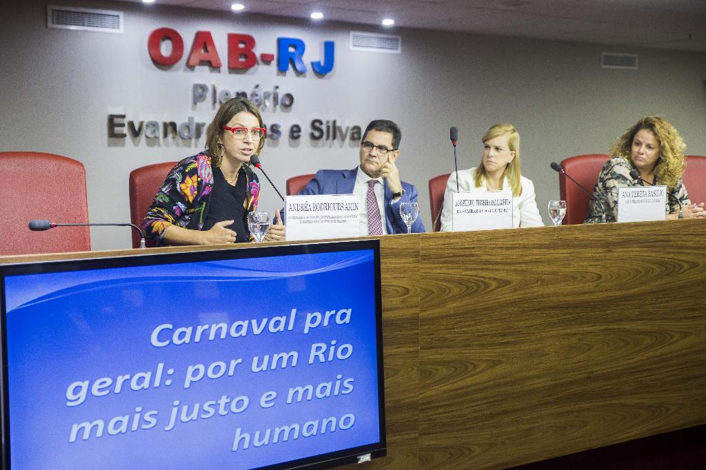 O Ministério Público do Estado do Rio de Janeiro (MPRJ) participou, na manhã de quinta-feira (28/02), do seminário ‘Carnaval pra Geral: por um Rio mais Justo e mais Humano’, realizado pela Ordem dos Advogados do Brasil Seccional do Rio (OAB/RJ), no Plenário Evandro Lins e Silva, na sede da instituição. O evento, que reuniu diversas autoridades e especialistas, teve como objetivo discutir práticas e políticas públicas para a promoção do respeito à diversidade no mais emblemático evento da cidade. Ao longo da programação, foram abordados temas como “A segurança do Estado a favor do cidadão” e “Ações de conscientização para o combate à intolerância de gênero, ao desaparecimento de crianças e ao assédio à mulher”.