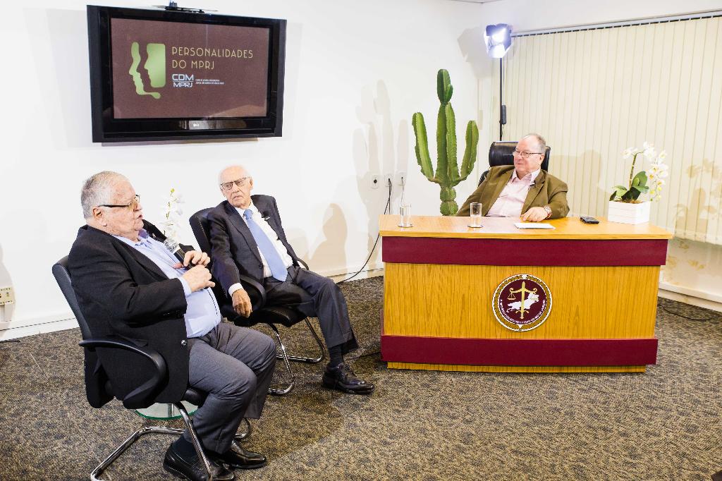 O Ministério Público do Estado do Rio de Janeiro, por meio do Centro de Memória João Marcello de Araújo Júnior (CDM/MPRJ), promoveu, na manhã desta terça-feira (30/04), a gravação da sétima edição do programa ‘Personalidades do MPRJ’. Dessa vez, os entrevistados do talk show, que levou o nome de ‘Dois Civilistas e o Ministério Público’, foram os procuradores de Justiça aposentados David Milech e Norton Esteves Pereira de Mattos. Pela primeira vez, a atração, conduzida pelo procurador Márcio Klang, coordenador do CDM/MPRJ, foi gravada nas instalações do edifício-sede do MPRJ, com a presença de grande público e contando também com transmissão ao vivo.