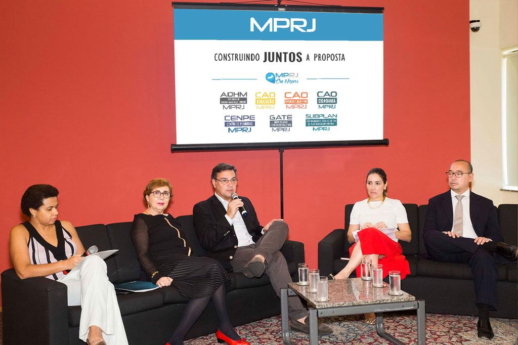 A mesa de abertura do encontro contou com as presenças do procurador-geral de Justiça, Eduardo Gussem, da subprocuradora-geral de Justiça de Planejamento Institucional, Maria Cristina Tellechea, dos coordenadores do CAO Educação/MPRJ, Débora Vicente, do CAO Infância e Juventude/MPRJ matéria infracional, Luciana Benisti, da Cidadania, Leonardo Kataoka, e da assessora da ADHM/MPRJ, Eliane de Lima Pereira. O PGJ ressaltou a importância da construção coletiva do texto. “Esta é uma iniciativa que merece ser parabenizada, já que a proposta traz uma atuação dialogada, com olhar preventivo e muito importante para que possamos construir políticas públicas que efetivamente atinjam de maneira positiva a população do estado”, afirmou Gussem.