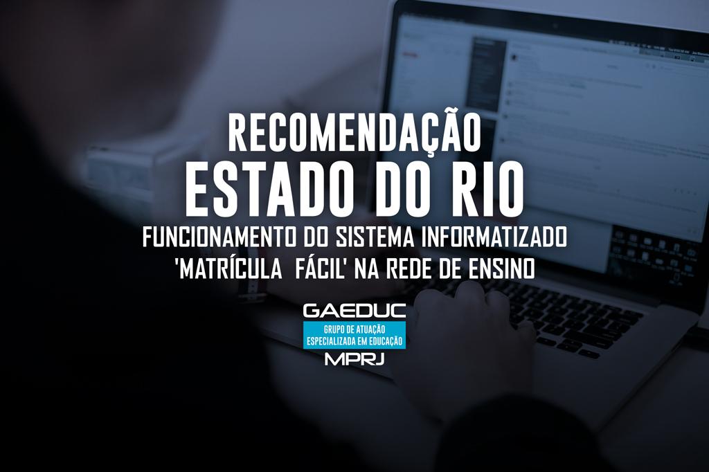 O Ministério Público do Estado do Rio de Janeiro (MPRJ), por meio da 2ª Promotoria de Justiça de Tutela Coletiva de Proteção à Educação da Capital e do Grupo de Atuação Especializada em Educação (GAEDUC/MPRJ), expediu, na última sexta-feira (19/06), Recomendação ao governador Wilson Witzel e ao secretário Estadual de Educação, Pedro Fernandes, para que adotem todas as medidas administrativas necessárias para reestabelecer o funcionamento e o acesso de eventuais interessados ao sistema informatizado do 'Matrícula Fácil', por meio do endereço eletrônico www.matriculafacil.rj.gov.br.