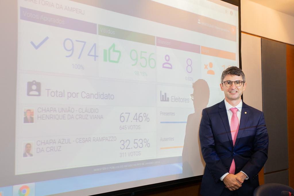 O procurador de Justiça Cláudio Henrique da Cruz Viana foi eleito, nesta segunda-feira (05/10), presidente da Associação do Ministério Público do Estado do Rio de Janeiro (Amperj). Cláudio Henrique irá dirigir a Amperj pelo biênio 2021/2022. A Chapa União obteve 645 votos de um total de 956 válidos, um percentual de 67,46%. Já a Chapa Azul, liderada pelo promotor de Justiça Cesar Rampazzo da Cruz, obteve 311 votos. No total, foram computados 974 votos, sendo 10 nulos e oito em branco.