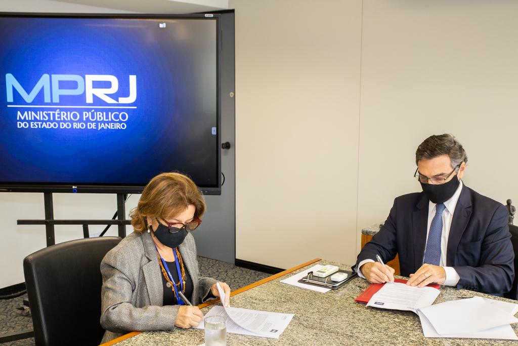 O Ministério Público do Estado do Rio de Janeiro (MPRJ), por meio do procurador-geral de Justiça, Eduardo Gussem, assinou nesta quinta-feira (08/10) convênio de cooperação com o Instituto Estadual do Ambiente (INEA) para promover e apoiar ações conjuntas para a implantação de projetos de Soluções baseadas na Natureza (SbN), visando garantir a segurança hídrica na Região Hidrográfica da Baía de Guanabara. O convênio foi assinado pelo PGJ; pelo coordenador do Grupo de Atuação Especializada em Meio Ambiente (GAEMA/MPRJ), promotor de Justiça José Alexandre Maximino; pela subsecretária de Estado de Recursos Hídricos e Sustentabilidade e presidente interina do INEA, Diane Mara Ferreira Varanda Rangel; e pelo diretor de Biodiversidade, Áreas Protegidas e Ecossistemas do Instituto, João Eustáquio Nacif Xavier.