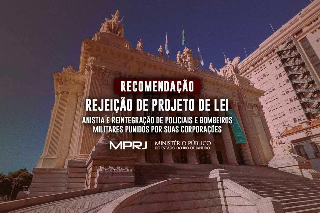 O Ministério Público do Estado do Rio de Janeiro (MPRJ), por meio do Procurador-Geral de Justiça, Eduardo Gussem, expediu a Recomendação nº 20/2020, dirigida ao presidente da Assembleia Legislativa do Estado (Alerj), visando à rejeição, pelo plenário da Casa Legislativa, do Projeto de Lei n.º 1.326/2019, que versa sobre a concessão de anistia aos policiais militares e bombeiros militares excluídos dos quadros de suas respectivas corporações em decorrência de atos administrativo-disciplinares punitivos, bem como sobre a possibilidade da reintegração dos mesmos à corporação de origem.