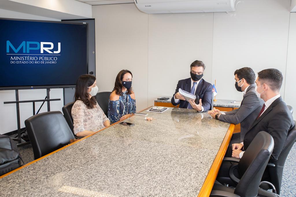 O procurador-geral de Justiça, Eduardo Gussem, recebeu nesta quinta-feira (15/10) o relatório final da Comissão Especial da Alerj para fiscalizar os gastos do Estado no combate à pandemia do novo coronavírus, a Comissão do Covid-19/Alerj. O documento foi entregue pelo relator da comissão, o deputado estadual Renan Ferreirinha. Estiveram na reunião a subprocuradora-geral de Justiça de Assuntos Cíveis e Institucionais, procuradora de Justiça Ediléa Gonçalves, a coordenadora do CAO Saúde/MPRJ, promotora de Justiça Márcia Lustosa, e o chefe de gabinete do deputado, Gustavo Ribeiro.