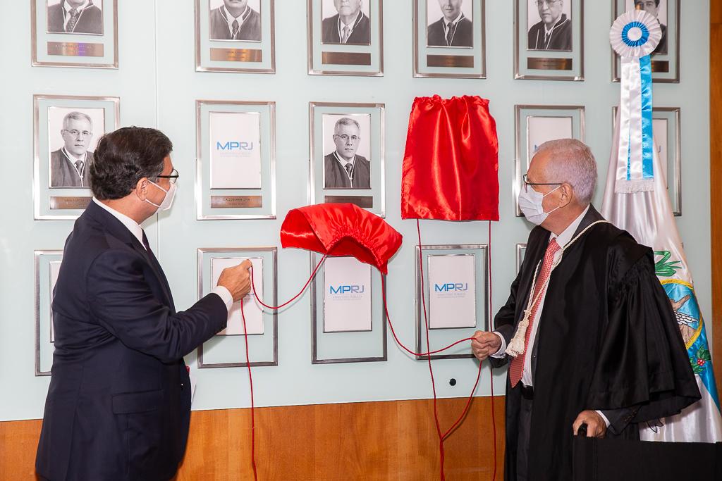 O procurador-geral de Justiça. Eduardo Gussem, e o subprocurador-geral de Justiça de Assuntos Institucionais, Marfan Vieira, fizeram o descerramento, em cerimônia acompanhada por diversas autoridades, entre elas o governador do Estado, Claudio Castro, o presidente da Alerj, André Ceciliano, o novo procurador-geral de Justiça, Luciano Mattos, e a corregedora-geral do MPRJ, Luciana Sapha. Em razão de sua condição clínica, o discurso de Marfan Vieira, que recupera-se de Covid-19, foi lido por Eduardo Gussem.